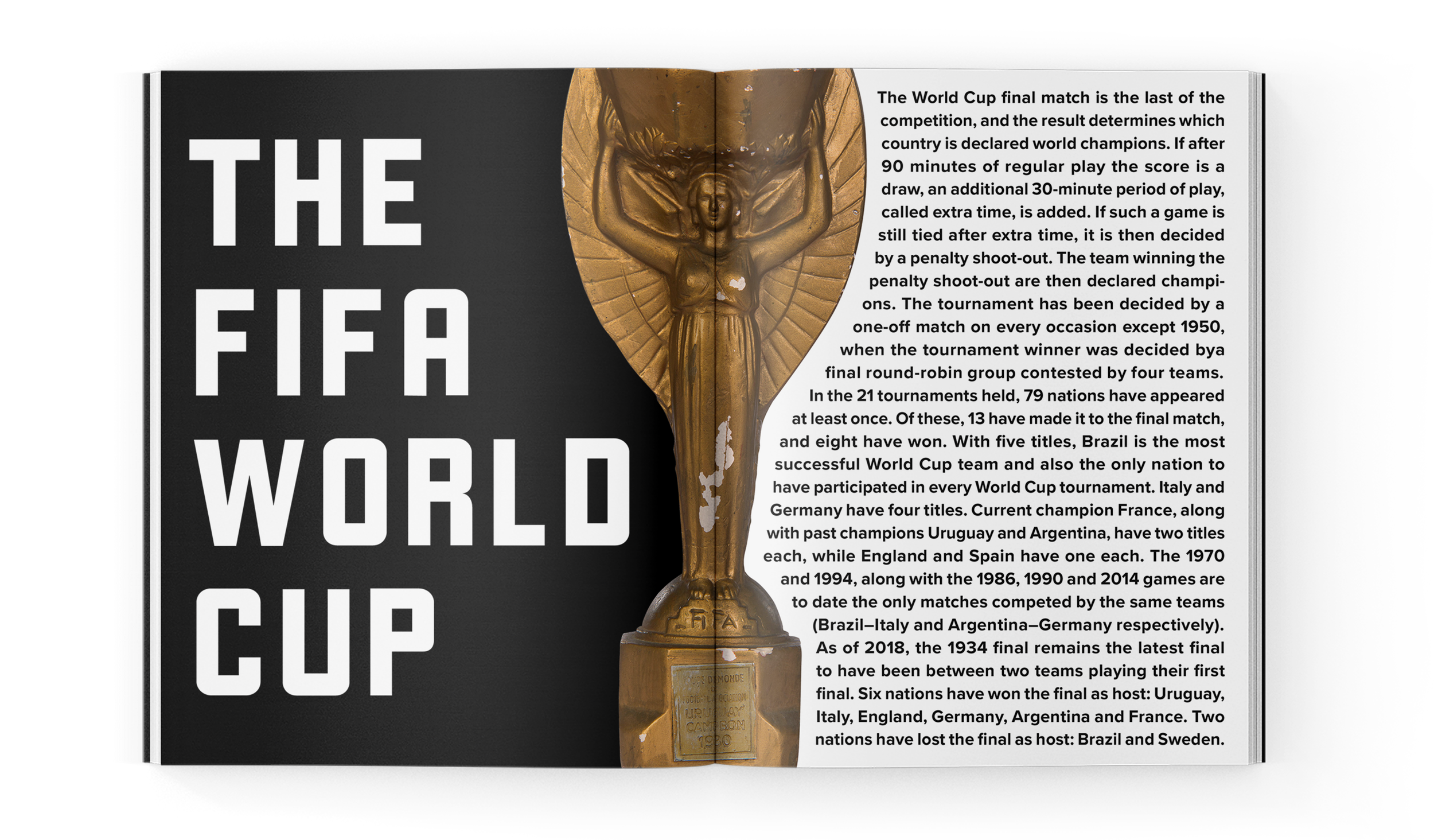 Client Categories Every four years, thirty-two of the best men’s national soccer teams from across the globe come together to compete for the title of the Fifa World Cup. This project takes a look back at what has changed since the first tournament in 1930 and the most recent in 2018, specifically focusing on documenting the final game of each of the 21 Fifa World Cups that have been held. For any true soccer fan, this 90-page book is a must have! Capturing over 92 years of history. Since I’m a massive soccer fan, this was a dream project. I was able to take a deep dive into the rich history of the sport, aiming to create new and visually engaging designs to showcase the defining moments of the world’s most beloved sporting competition.